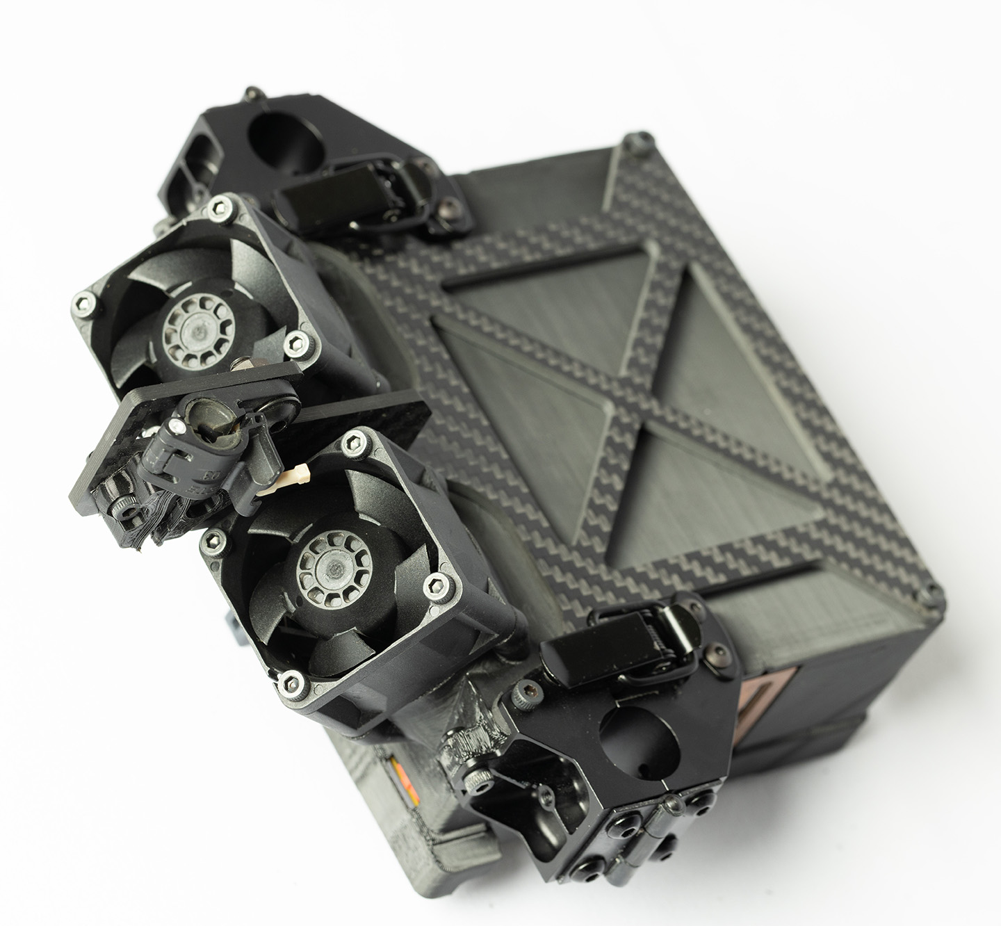Carbon-fibre panel with real-time status display, dual cooling fans, and the micro-cable outlet